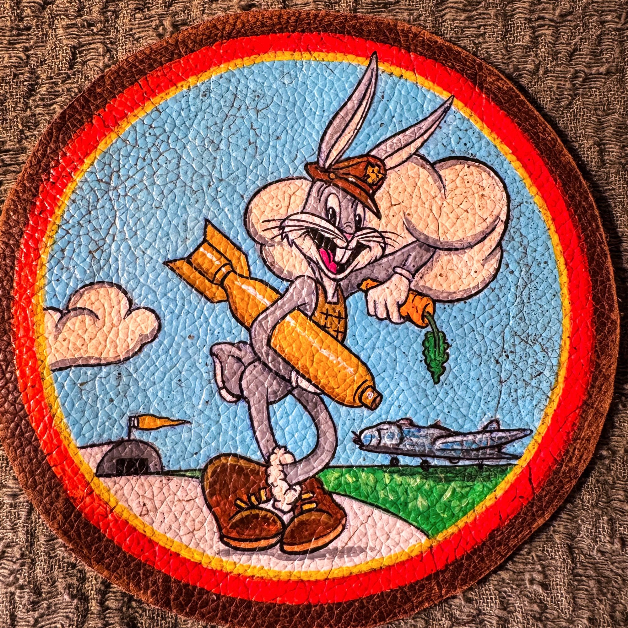 324th Bomb Squadron hand painted leather patch featuring Bugs Bunny. Painted on real leather. Patch measures 13 cm across.