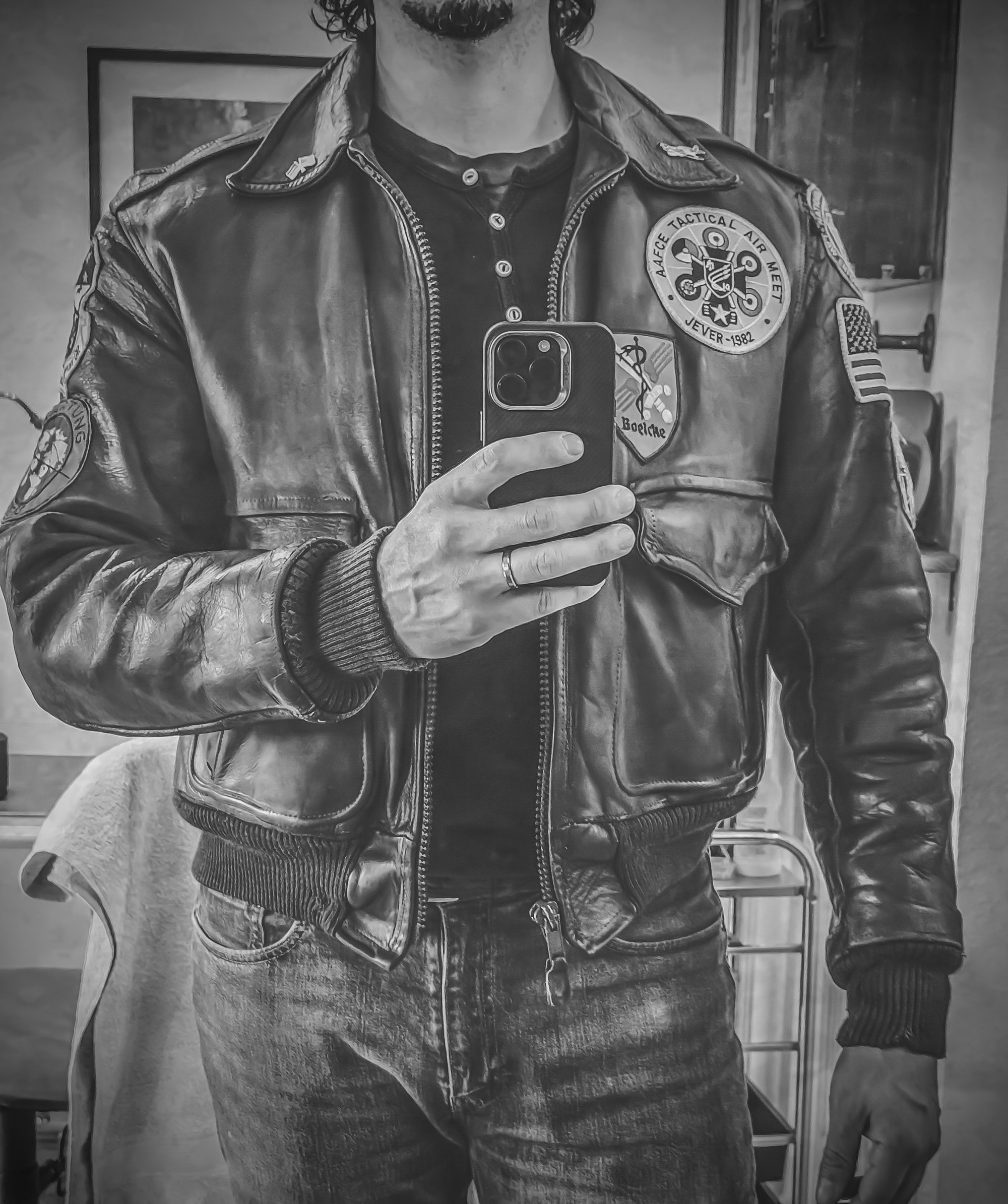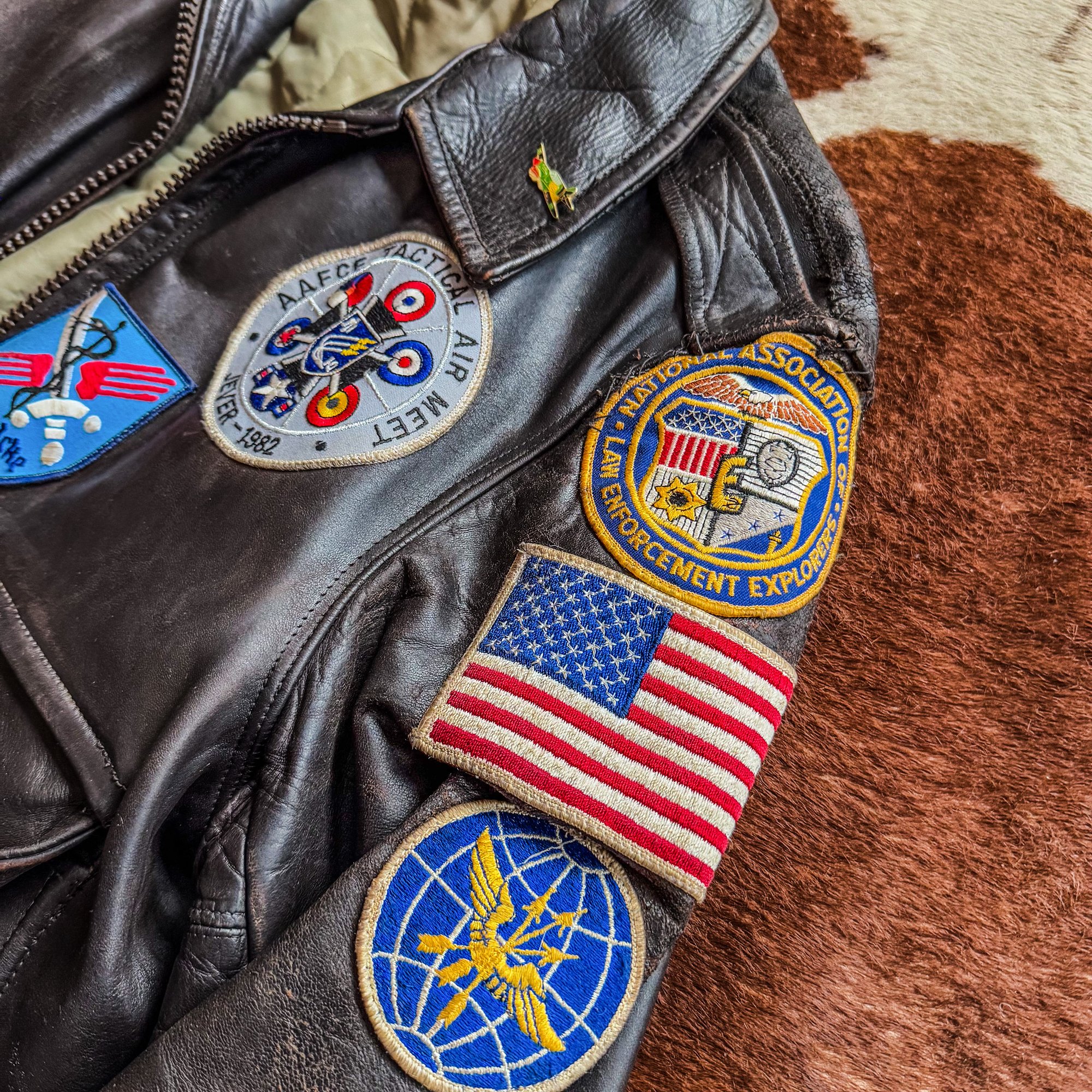 This jacket was pilot worn and shows traces of use. Going by the patches it was used by a US pilot back in 1982 Germany. Probably a private purchase by the pilot and not military issued.